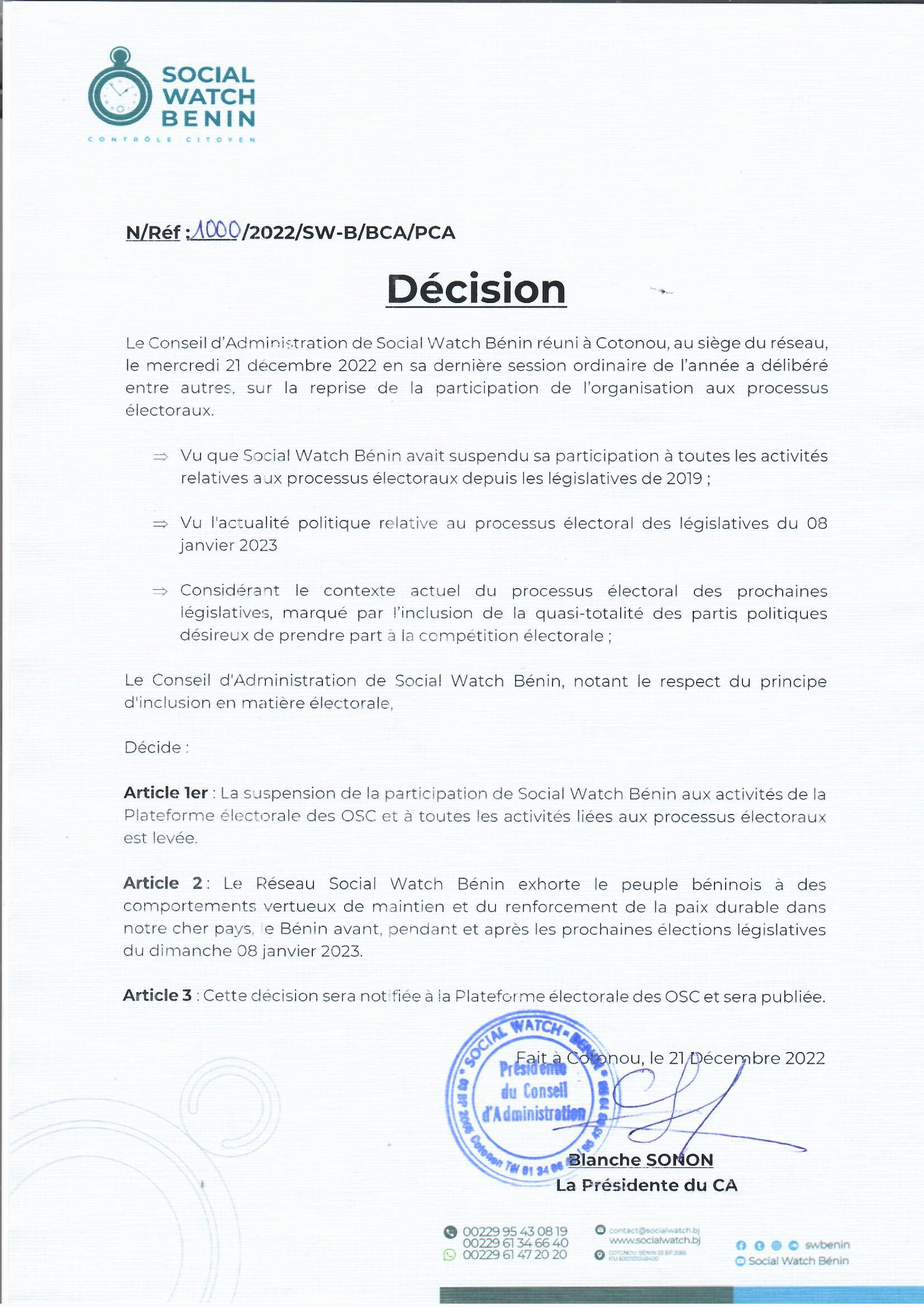 ActualitéDémocratie Participation aux processus électoraux au Bénin Social Watch Bénin lève sa suspension Par Cell.Com - 31 décembre 2022 0 775